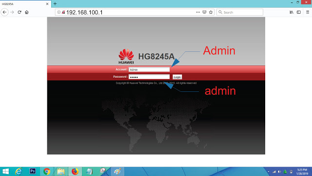 - setelah di buka, bisa di ketikkan 192.168.100.1, dan akan terbuka portal, lalu anda bisa isi Accoun : Admin (huruf A nya besar) dan Pasword : admin (huruf kecil semua), tekan LOGIN.